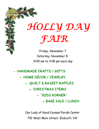 Join us for our annual Holly Day Fair featuring crafts, home decor, raffle baskets, a bake sale, and more!