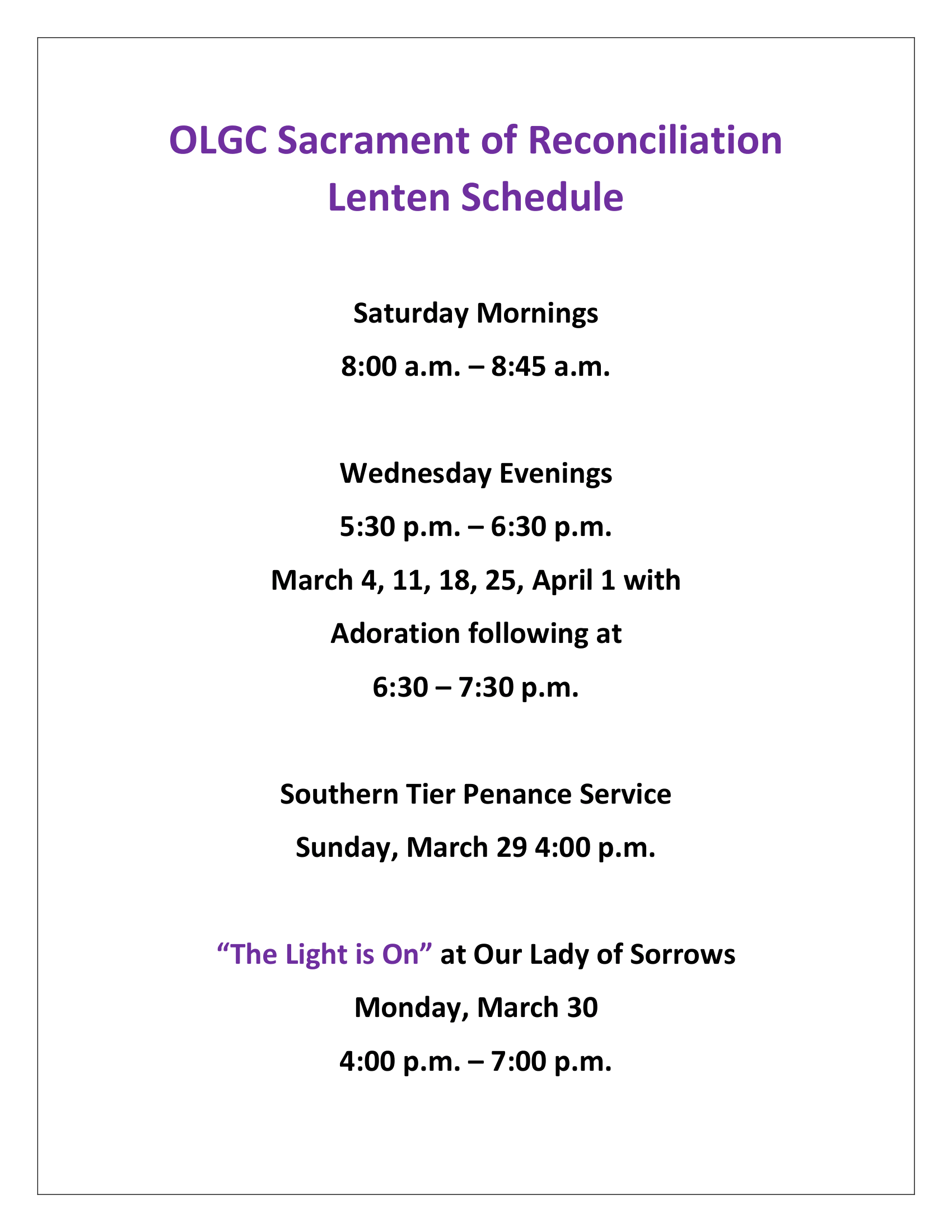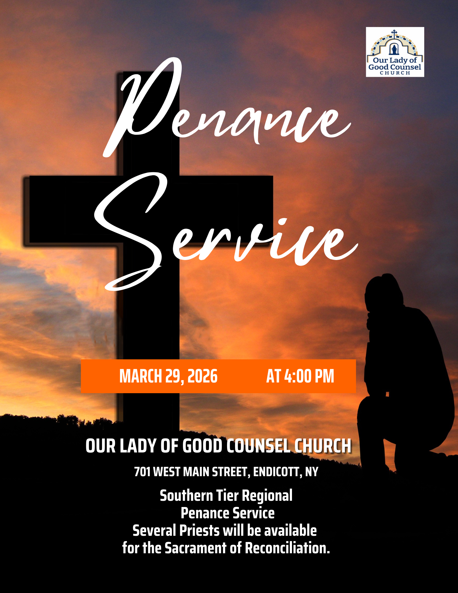 Southern Tier Penance Service will be on Sunday, March 29th at 4:00 p.m. with multiple priests available to hear confessions.