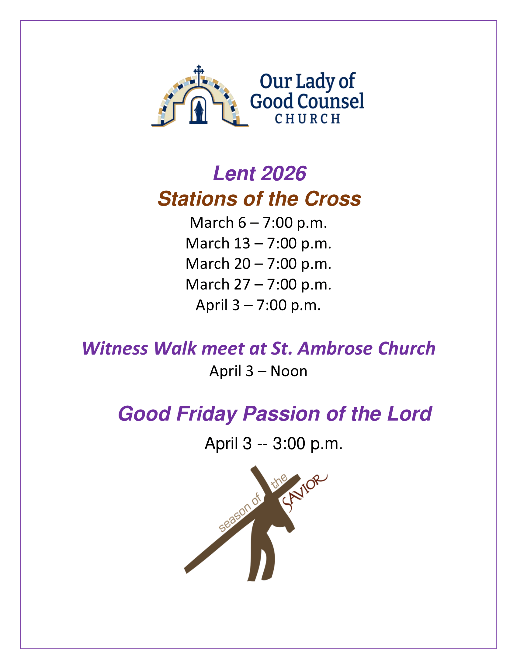 Friday at 7:00 p.m. Good Friday service will be at 3:00 p.m. with Witness Walk at 12:00 p.m. at St. Ambrose.