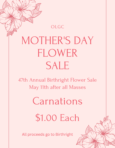 Flowers will be available after both Masses on May 11th for $1 each. Proceedes support Birthright.