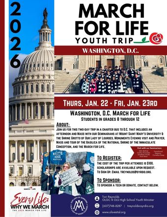 Join us for this two-day trip in a charter bus to D.C. The trip includes an afternoon and mass with our seminarians at Mount Saint Mary's University & the shrine grotto of Our Lady of Lourdes, a tour of the Basilica of the National Shrine of the Immaculate Conception, and the March for Life. The cost of the trip per attendee is $100. Scholarships are available upon request. To sign up, email treynolds@syrdio.org.