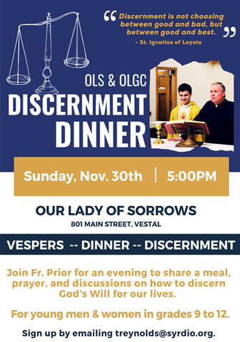 Young men & women in grades 9-12 are invited to join Fr. Prior for an evening to share a meal, prayer, & discussions on how to discern God's Will for our lives.