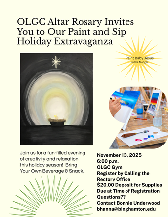 Join us for a fun-filled evening of creativity and relaxation this holiday season as we paint Baby Jesus in the Manger! Register by calling the Rectory. $20 deposit for supplies due at time of registration.