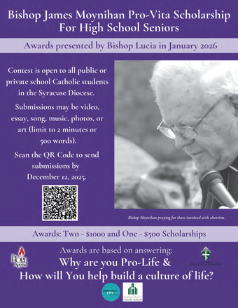 The Office of Family/Respect Life of the Diocese of Syracuse is once again offering a scholarship in honor of the late Bishop James Moynihan. The Pro-Vita Award is available to any public or private school senior in the diocese. Submit a video, song, photo, or work of art no longer than two minutes or 500 words answering the question "Why are you Pro-Life & how will you help build a culture of life?" Submissions are due by December 12, 2025.