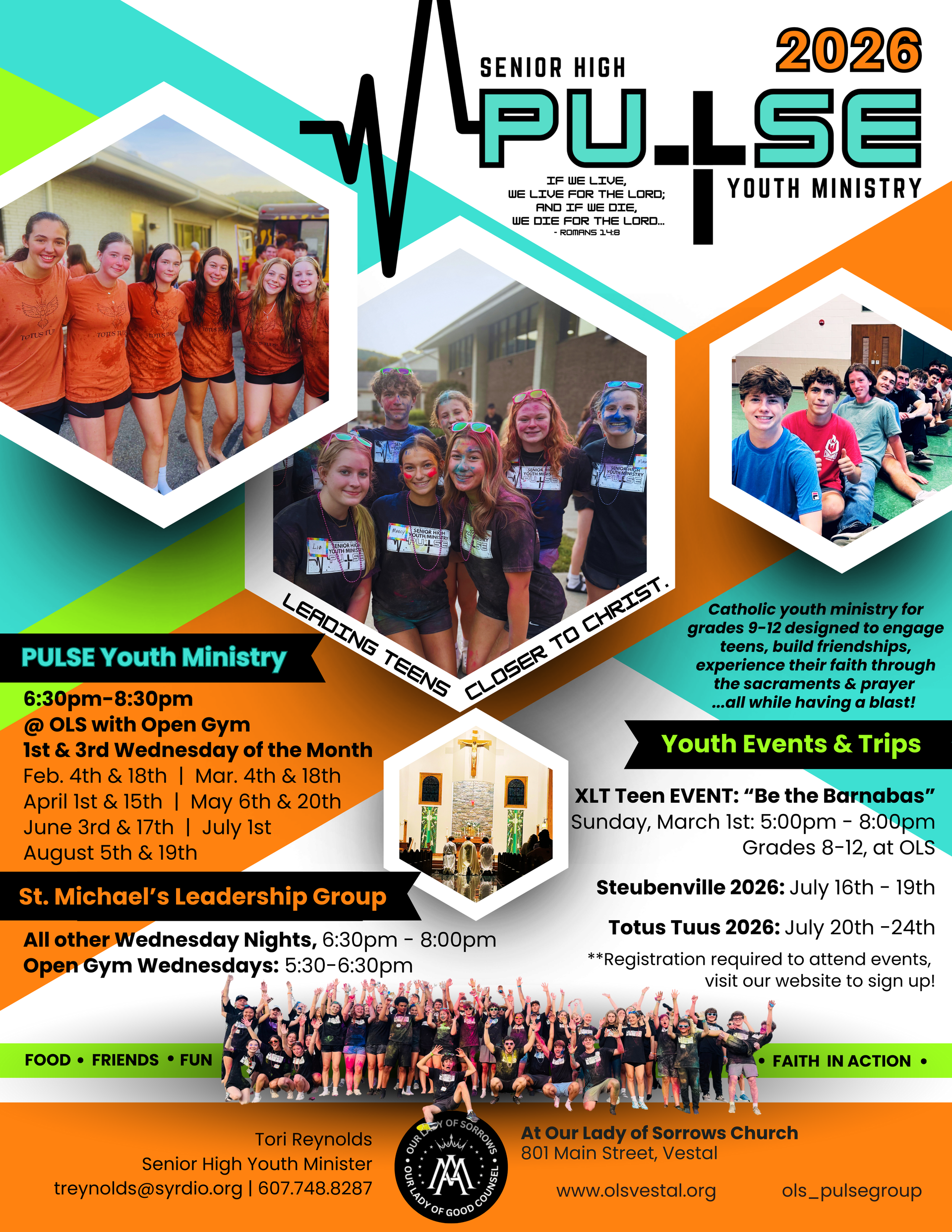 Join us every 1st and 3rd Wednesdays of each month at Pulse! Pulse is a Catholic youth ministry for grades 9-12 designed to engage teens, build friendships, experience their faith through the sacraments & prayer, all while having a blast!