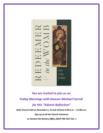 Dc. Michael will be hosting a series of advent reflections from Fr. John Saward's "Redeemer in the Womb". Sign up at the Church Entrances or by calling the Rectory.