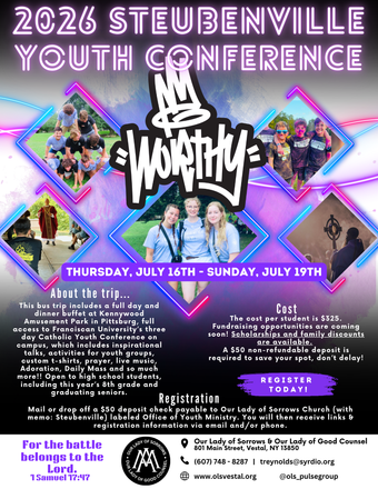 Mail or drop off a $50 deposit check payable to Our Lady of Sorrows Church (with memo: Steubenville) labeled "Office of Youth Ministry" . You will then receive links to registration information via email and/or phone.