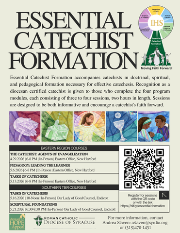 Essential Catechist Formation accompanies catechists in doctrinal, spiritual, and pedagogical formation necessary for effective catechesis. Recognition as a diocesan certified catechist is given to those who complete the four program modules, each consisting of three to four sessions, two hours in length. Sessions are designed to be both informative and encourage a catechist's faith forward. Register by clicking here.