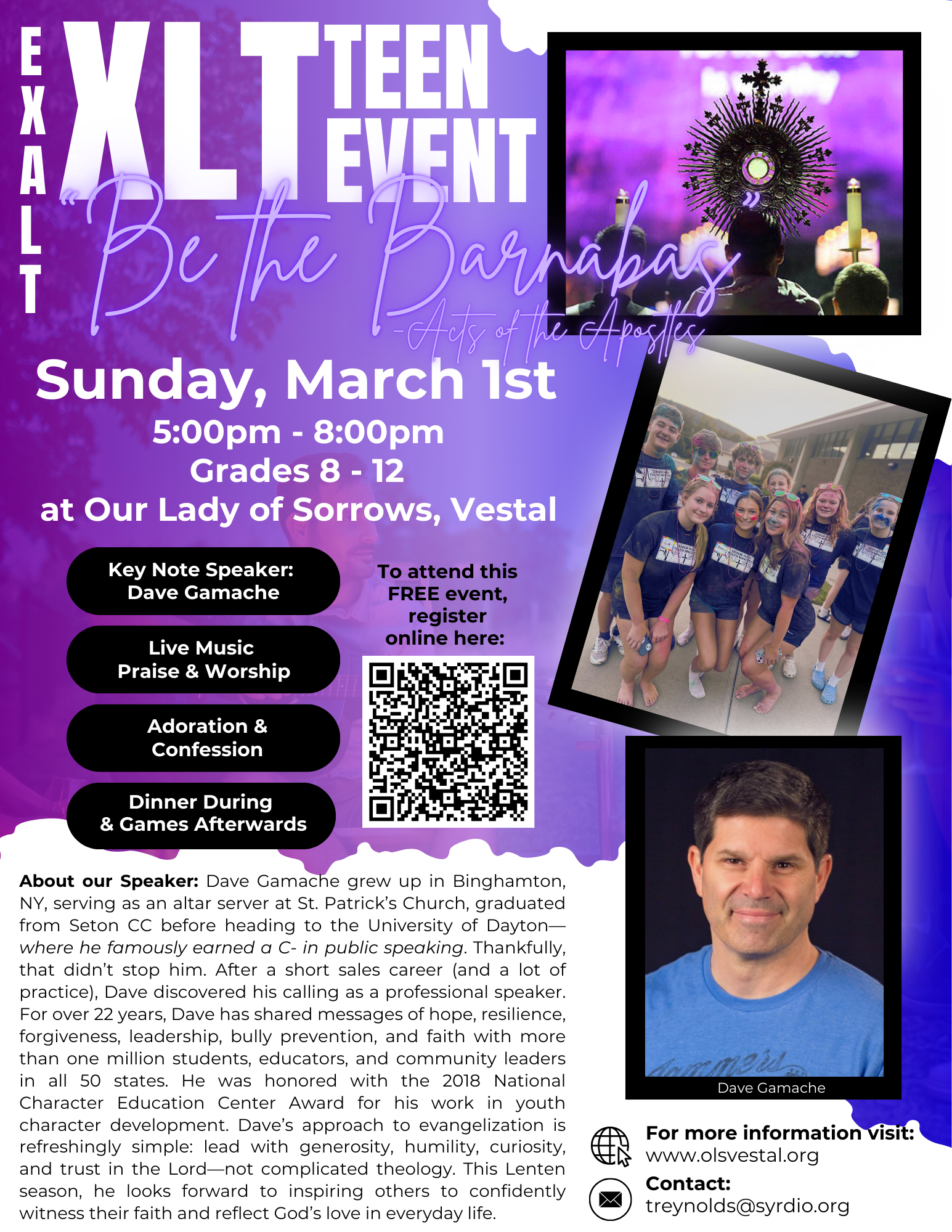 The mission of the Youth Ministry at Our Lady of Good Counsel is to support an engaging and encouraging environment in which youth are able to develop a personal relationship with Christ. Youth activities are offered for students in grades 6-12. Activities are scheduled throughout the year by the Diocese of Syracuse, Our Lady of Good Counsel, Our Lady of Sorrows, and Southern Tier Parishes.